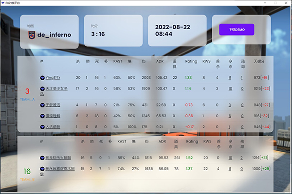 4、实时战绩统计系统,对CSGO每局比赛的各类数据进行实时记录,方便玩家了解自己和他人的水平变化状况。