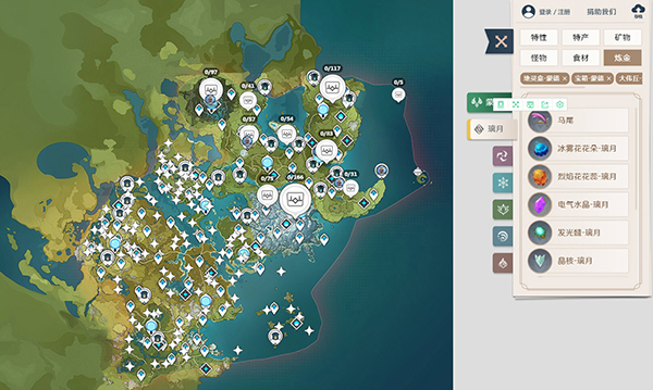3、原神WIKI地图工具查看左侧有所有地图物品、事件、神瞳等等的筛选。