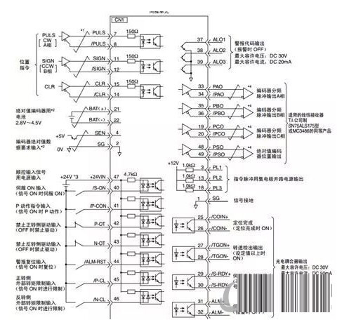 接线上,安川驱动器采用不同的控制方式,接线也是略有不同的。我们以位置模式为例介绍。硬件接线原理图如下: