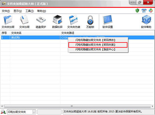 2、软件管理员密码设置完毕后,请在软件窗口的加密记录列表上找到您忘记密码的加密文件夹记录,在这条加密记录上单击鼠标右键。在弹出的菜单中选择,然后在弹出的窗口中输入文件夹加密超级大师的软件管理员密码即可。