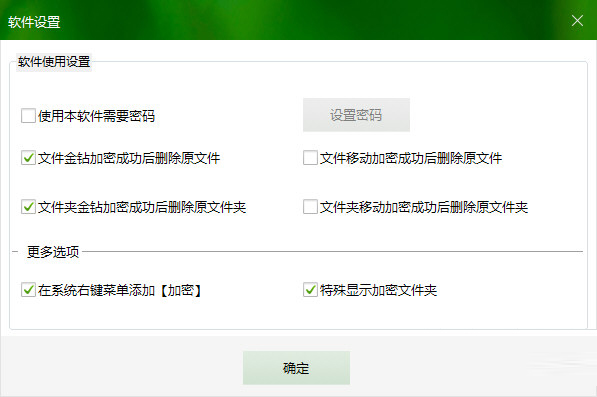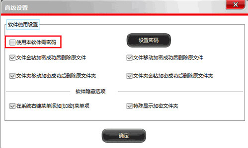 1、请打开文件夹加密超级大师,点击软件设置按钮,在弹出的高级设置窗口中选择第一项“使用本软件需密码”,然后设置软件的管理员密码。(如果您已经设置了软件管理员密码,请跳过此步)