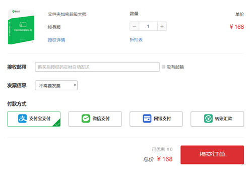 当你下载安装文件夹加密超级大师之后,程序只能进行试用,那么当你在使用过一段时间之后,就需要自己购买激活码来注册账号,进行永久使用了,不过这个费用是多少钱呢?现在还有一些用户不太清楚,那么小编从官网上了解了一下它的终身版费用。如下图所示: