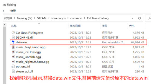 请先存档原data.win文件,如替换后无法小猫钓鱼汉化补丁无法正常使用可以直接换回来