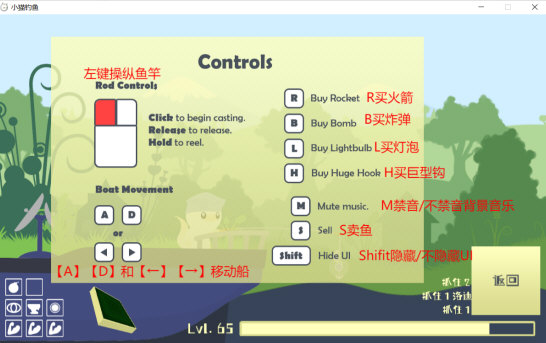 【A】【D】和【←】【→】移动船,左键操控鱼竿,R快速买火箭,B快速买炸弹,L快速买灯泡,H快速买巨大钩,M关闭/开启背景音乐,S出售鱼,Shift隐藏/显示UI