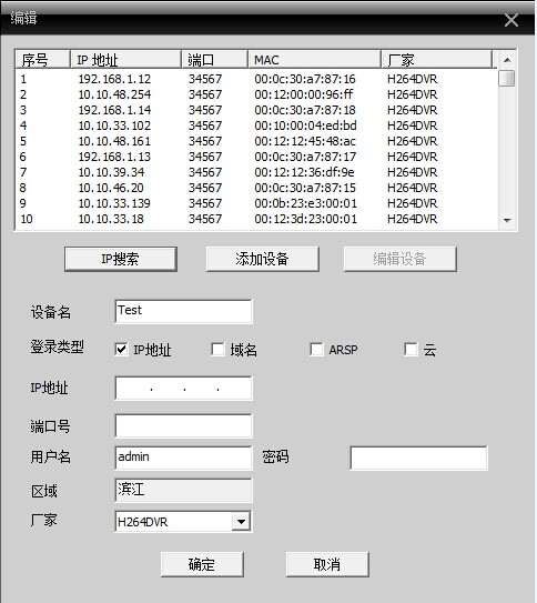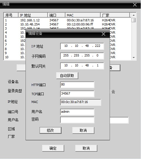 5.选中搜索到的设备,点击编辑设备 ,把IP地址改成局域网的IP地址,其他信息不动,如果没显示用户,请填写下 admin,然后点确定