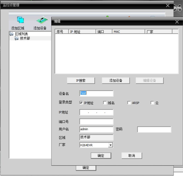4.选中已添加好的区域,点击添加设备,在新出现的界面点击IP搜索