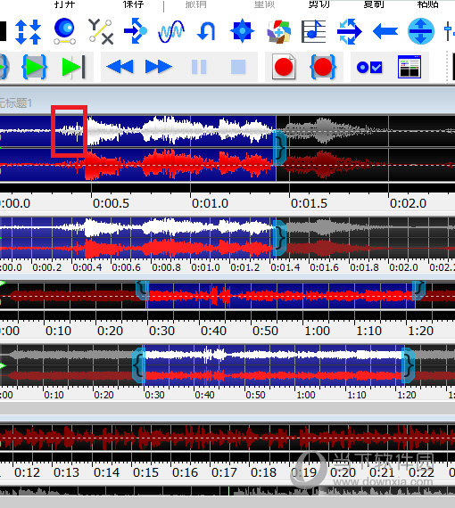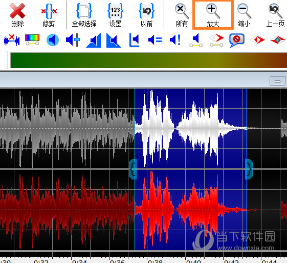 我们先在GoldWave中文版中找到需要保留的部分,大概在哪个位置,然后点击上方的“剪刀”,把这一段截取下来。这里有一个小细节,如果你需要的那段音频非常短,可以点击GoldWave中文版主页面上方的“放大”键,放大波形哦!截取音频之后,点击上方的“剪切”。