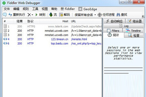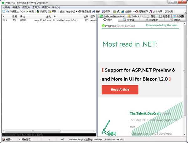 2、双击运行"Fiddler.exe"程序即可打开软件,可看到已全部汉化;
