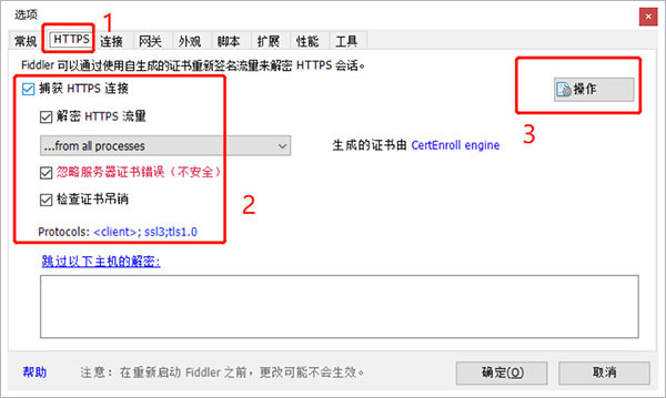 4、再点击HTTPS操作,使用自生成证书重新签名流量来解密,最后点击操作;