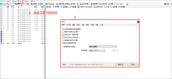 3、可以进行抓包,若发现网页打不开,则需要安装证书才可以,点击工具-选项进入以下界面;
