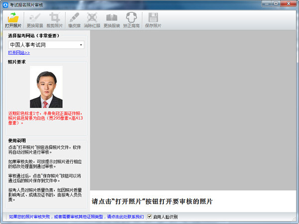 1、选择证照格式,打开一张照片或拍摄一张照片
