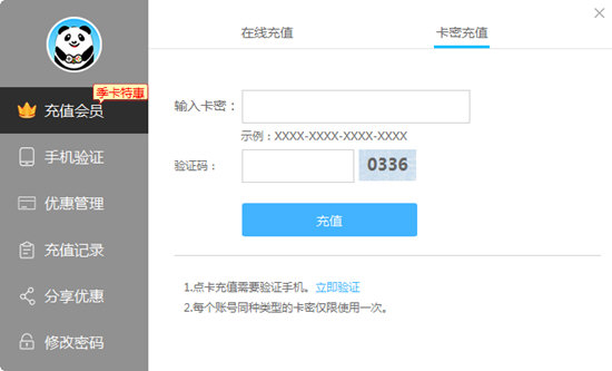 同时在熊猫加速器的官方公众号以及官方QQ群和微博中都会不定期赠送会员体验卡,如果你有幸得到了体验卡,请在熊猫加速器中点击上方你的帐号「会员中心」—「卡密充值」,输入卡密验证即可。