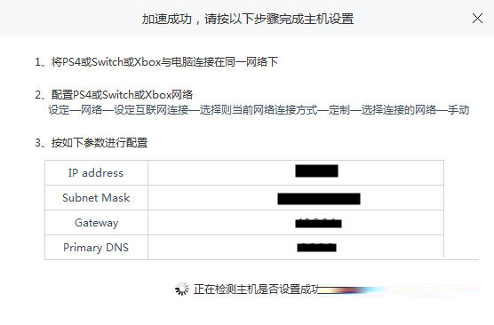 3、最后开始加速,加速成功后弹出PS4的网络设置指南,请按照上方所说打开你的PS4,进入网络设置。