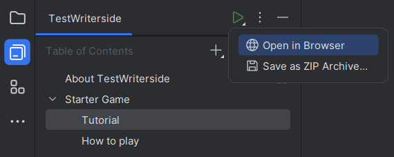 在Writerside工具窗口中上方有个按钮,单击”Open in Browser“或“Save as ZIP Archive”