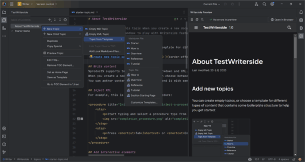 有了带帮助实例的文档项目之后,就可以右键目录向其中添加主题并开始编写内容,目前有5种 Markdown 主题和5种 XML 主题。