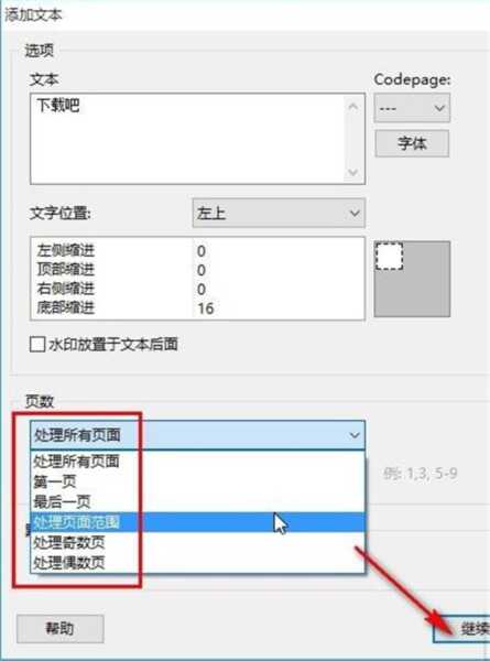 7、根据需求选择好水印位置之后,在页数这里点击下拉列表可以选择想要设置水印的PDF文件页面数量,然后点击继续按钮。
