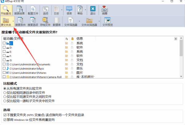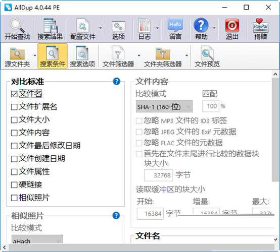 2、优秀的计划能力:AllDup是相当深的计划,和搜索非常灵活。打开“比较法”给你一系列的选择,这是非常有用的。例如,你可能会有重复的MP3文件的不同名称,搜索的大小可能会更成功。