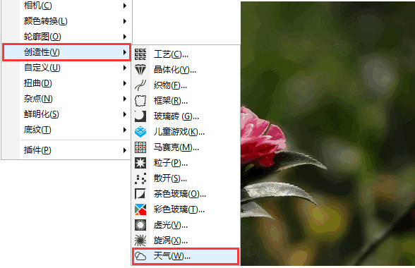 2、在图片在选中的状态下,执行“位图>创造性>天气”滤镜。