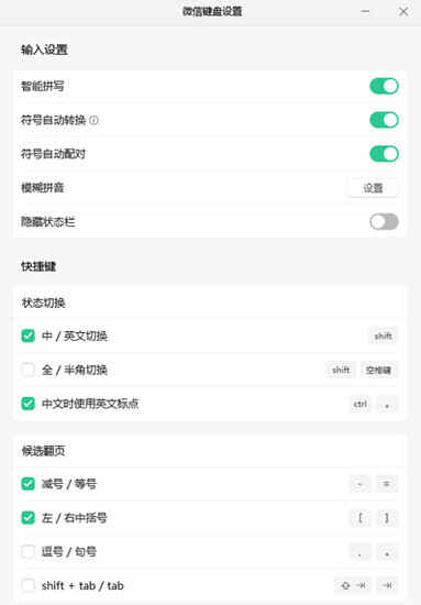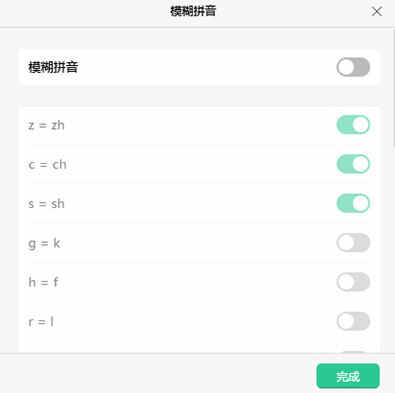 2、模糊拼音:支持自行设置z=zh、c=ch、g=k、h=f等等多种模糊拼音,让分不清前鼻音后鼻音以及h、f的用户也能轻松拼出自己想说的话。