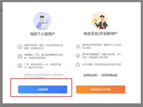 1、WPS 2019安装完后,双击打开桌面上图标,会弹出下图,分为个人版用户和会员/商业版用户,个人版用户就点击“免费使用”按钮,会员/商业版用户可以点击“畅享高效办公体验”按钮,小编这里选择免费使用。