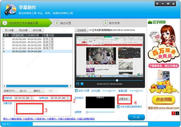 2、设置字幕开始时间和结束时间,如果字幕内容较多,一行显示不了,可以分别设置几个时间段,每个时间段显示不同的内容就可以了。