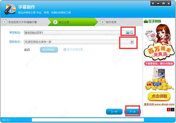 4、点下一步,在打开的对话框,选择输出文件位置,在打开的对话框输入想要保存的文件名,然后点保存,输出文件格式,可以选择源视频格式,也可以选择其他格式。