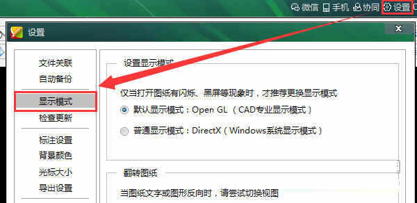 答:CAD迷你看图/画图默认采用了专业的OpenGL图形引擎,可能会有很少数显卡不支持,您可以点击软件右上角【设置】> “选择显示模式” > 选择"否“ > 切换到普通模式。