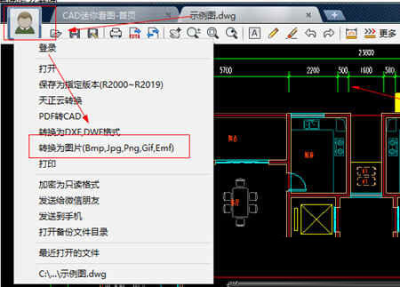 1、用户选定一个需要截图的图纸,在它的编辑界面中点击右上方的人物头像功能,选择“转换为图片(BMP,JPG,PNG,GIF,EMF)”功能选项。