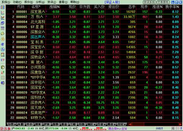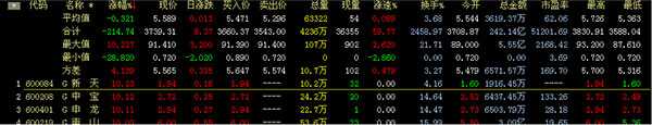 敲数字81、82、83、84、85、86、87,可分别调出上海A、B股,深圳A、B股,沪债、深债,深沪A股的综合排名。系统用9个排成方阵的小窗列出所选市场的股票的涨幅、跌幅、振幅、5分钟涨幅、5分钟跌幅、量比、委比、成交金额排名。