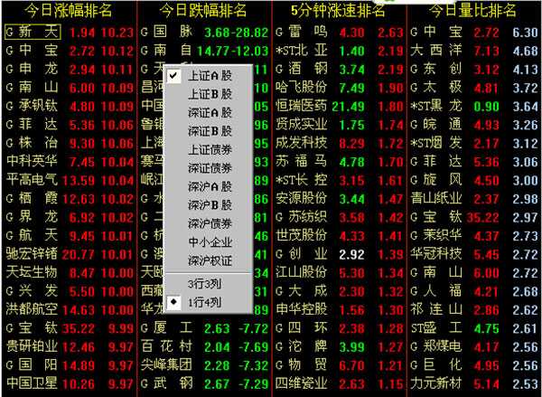 在综合排名中可以使用右键菜单选择查看不同的市场信息,同时可以按“3行3列”或“1行4列”的方式选择查看的方式。