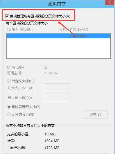 5、在虚拟内存设置窗口,将”自动管理所有驱动的分页文件大小“前面的勾选去掉。