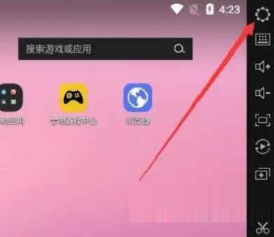 打开雷电模拟器软件界面后,点击右上角“设置”按钮(齿轮图标)进入,如图箭头所指位置