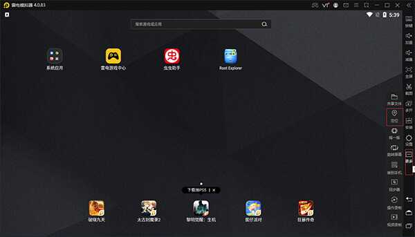 下载雷电安卓模拟器,按照指示完成安装操作之后,运行模拟器并点击右侧【更多】栏定位按钮,就会弹出设置定位的界面。