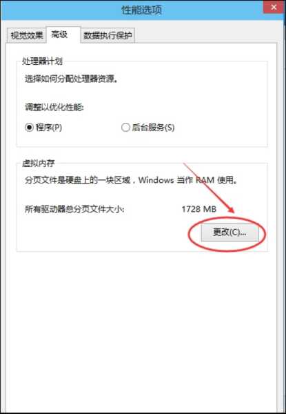 4、在性能选项对话框的高级选项卡里点击虚拟内存下方的更改。