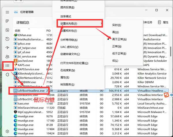 五、打开任务管理器,进入详情的页面,找到模拟器的进程进行设置优先级高于正常。