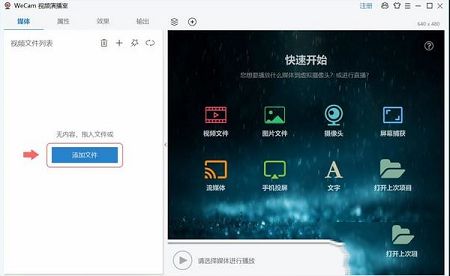 打开软件,在快速开始界面处(可通过 项目 > 新建项目 显示)您可以快速创建包含不同媒体对象的项目。默认情况下已经创建了一个“视频文件”对象,点击“添加文件”按钮便可为此对象导入视频文件: