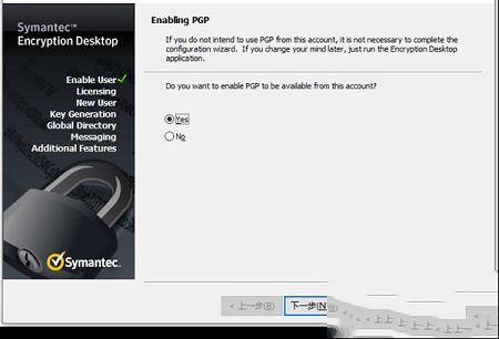 6、重启软件后,提示“您是否希望通过此帐户启用PGP?”点击yes,点击下一步