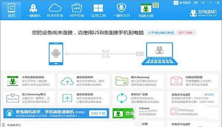 1.将手机通过USB连接线连接到电脑上,并切换至调试模式,然后打开软件,在检测到有机型连接后,会自动给该机型安装驱动。驱动安装成功之后,在左侧会显示已经连接的手机的屏幕画面,注意要保持手机是正常开机状态。2、首先在奇兔刷机顶端的菜单栏中点击“ROM市场”,然后在ROM市场的列表中找到并下载适合自己手机型号的ROM包。