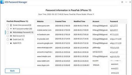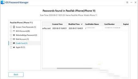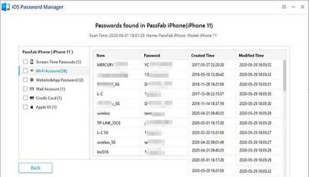 扫描后,您将看到所有密码信息,包括Wi-Fi密码,网站和应用程序密码,邮件帐户密码,屏幕时间密码,Apple ID密码和信用卡信息。