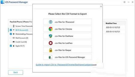 点击右下角的“导出”按钮,然后您可以选择导出1Password,Chrome,Dashlane,LastPass,Keeper等的密码。