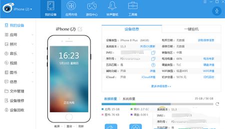 4、我们点击信任后,电脑上运行的iTools软件就可以和手机连接起来了,我们点击我的设备选项就可以来查看手机的基本信息了,如下图所示,你可以看到手机数据容量、系统容量等,接下来我们就可以对手机进行一些数据的传输、刷机等操作了。有需要的小伙伴赶紧来试试吧。