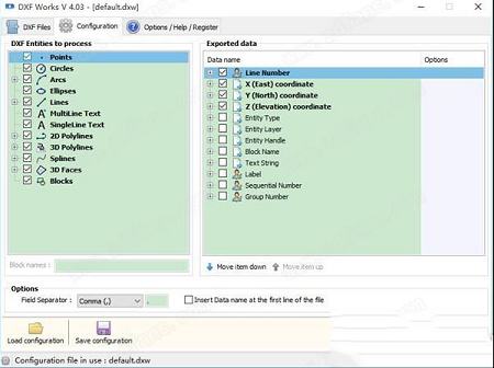 下一步,您需要进入“配置”部分,在这里您可以查看要处理的DXF实体。仅举几例,您将获得一些选项,例如点,圆,弧,线,样条线,3D面和块。
