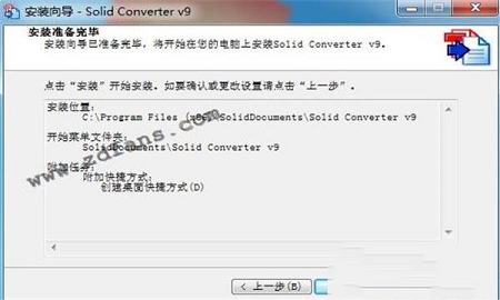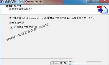 5、选择附加任务:是否为Solid Converter V9软件创建桌面快捷方式,为了方便使用它这里选择勾选。点击下一步;