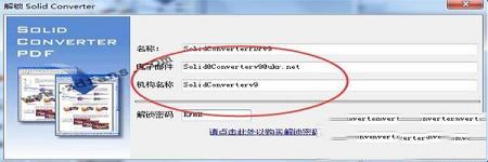 2、在以下界面中输入如下内容:Name位置填写【SolidConverterPDFv9】,E-mail填写:【Solid@Converterv9@ukr.net】,Organization填写【SolidConverterv9】、解锁密码处填写【KFMK】,然后点击【确定】按钮;(以上解锁码信息来源于网络,仅供参考!)