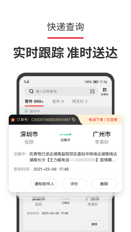 顺丰速运是一款提供物流信息查询以及寄收服务的应用,应用全面升级,为用户提供全新的体验,界面内容十分的清晰,能够让你轻松找到需要的服务,直观的看到功能,包括签到、会员管理、地址簿、服务范围划定、运费时效等功能;在线极速下单,任意选择寄件的场景,输入收货以及寄件的信息,一键点击下单,立即为你呢生成订单号;能够随时随地掌握最新的动态,快速查单更方便,查看到详细的订单配送物流,及时浏览和查询,检测到配送的时间,智能根据进度,显示出物流配送的预计时间,订单查询更方便。