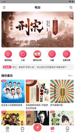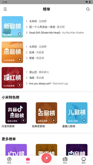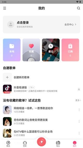 3、这里展示的标签也是十分极速,支持根据精选、榜单、电台、我的等栏目中进行点击的,曲库全;