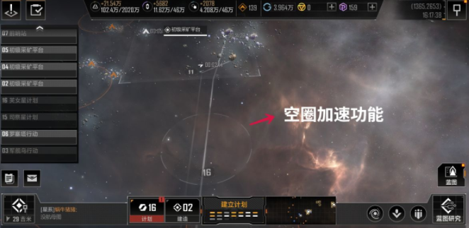 空圈加速功能,是玩家前期最容易忽视的功能之一,但实用性不可忽略。每个计划圈建立后,都可以利用舰队激活,获得计划圈位置的曲率坐标。在了解曲率坐标后,其他舰船可以进行曲率航行,加快通过该片区域的速度。需要注意的是该计划圈内,建筑或舰队已被敌方摧毁,则无法获取曲率坐标,将失去曲率航行的能力。