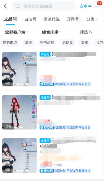1、丰富的账号类型,可以满足不同玩家的账号购买需求。在交易猫幻塔手游交易专区当中,玩家们不仅可以获取各种高级游戏账号的交易信息,还可以通过筛选功能,去了解到其他类型的游戏账号,包括了初始号、自抽号等等,这些游戏账号将为玩家带来另外一种游戏体验,获取代入感的方式也会提高。