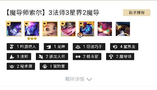 这次给大家推荐的阵容名字叫魔导师索尔,组成英雄棋子有解脱者·塞拉斯、海兽祭司·俄洛伊、暮光星灵·佐伊、仙灵女巫·璐璐、铸星龙王·索尔、大头、星界游神·巴德,最终组成的羁绊为一吟游诗人(每场战斗活下来的棋子都可以给自己增加一个符号,这个符号能让自己刷到高费卡的概率提升,每次提升百分之一)、一龙神(当有龙神在场上时,会直接占据两个卡位,此外自身还会获得七百点额外血量,这个效果只会作用于一个龙神)。