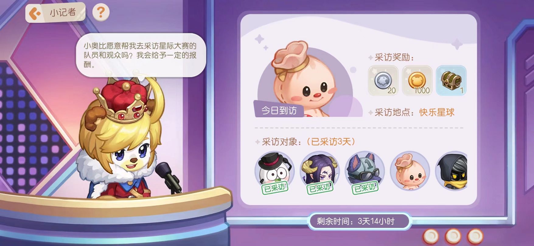 参与星际小记者这个活动的玩家,可以先前往活动地点,领取任务并看清楚今天要采访的角色是哪位。确认好之后,只要在星际大赛这个场景中找到这个角色。由于人物是会移动的,所以玩家需要等这个人物停下来之后接近它,然后开始采访,对话结束后玩家就会获取相应的奖励。